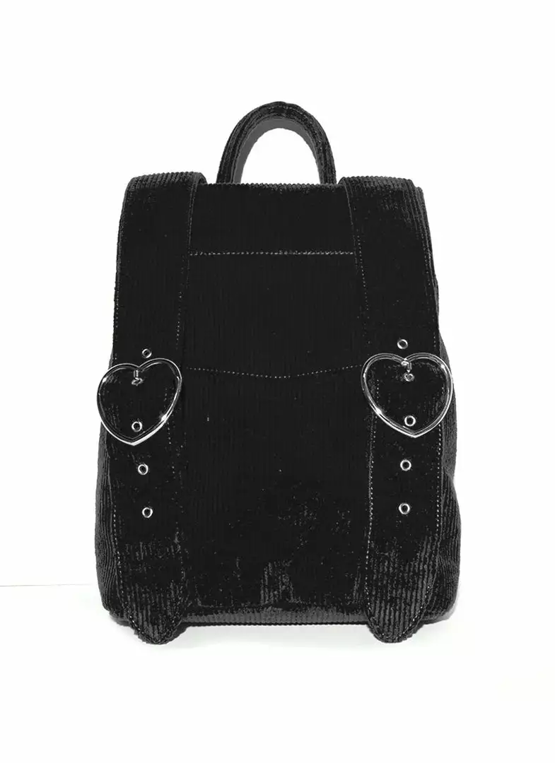 This black corduroy backpack features heart buckles, magnetic closures, adjustable straps, a drawstring, canvas lined interior, and zipper pouch inside.