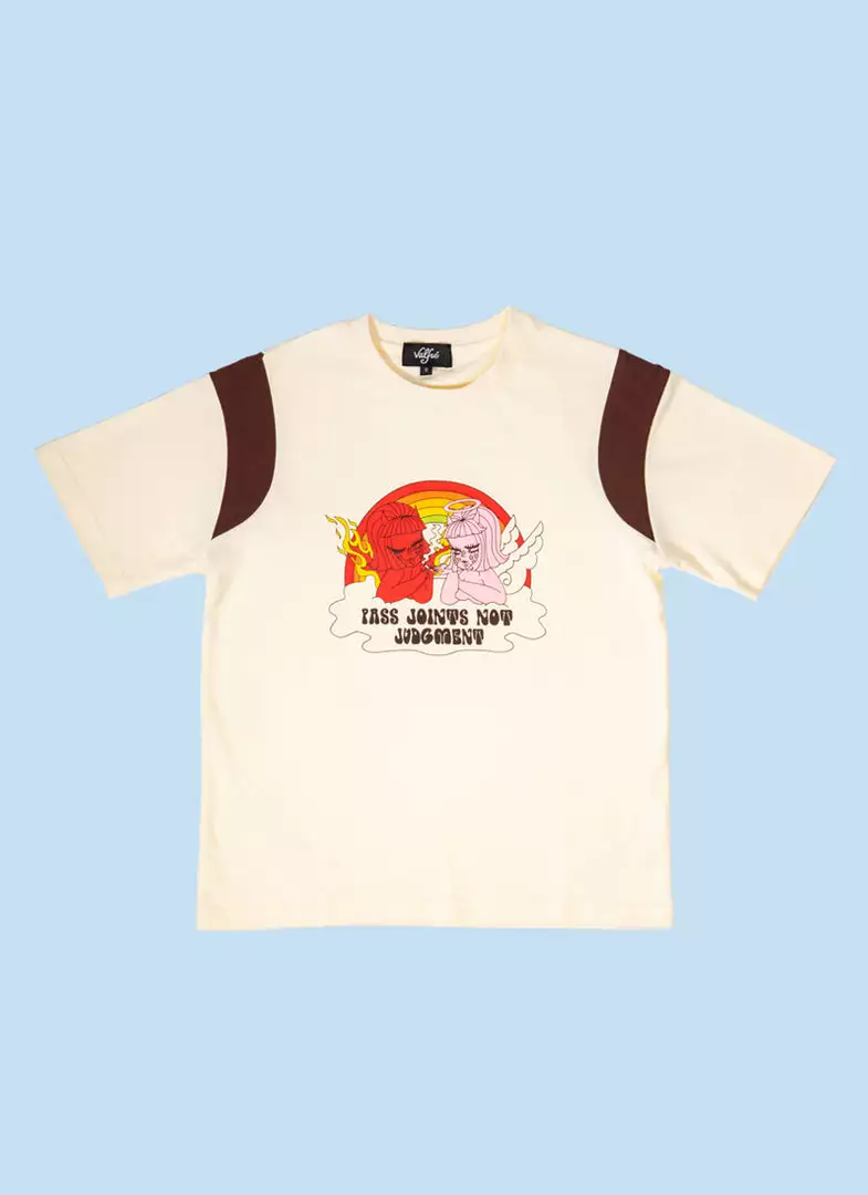 This super soft white tee features original Valfré artwork and color block details .