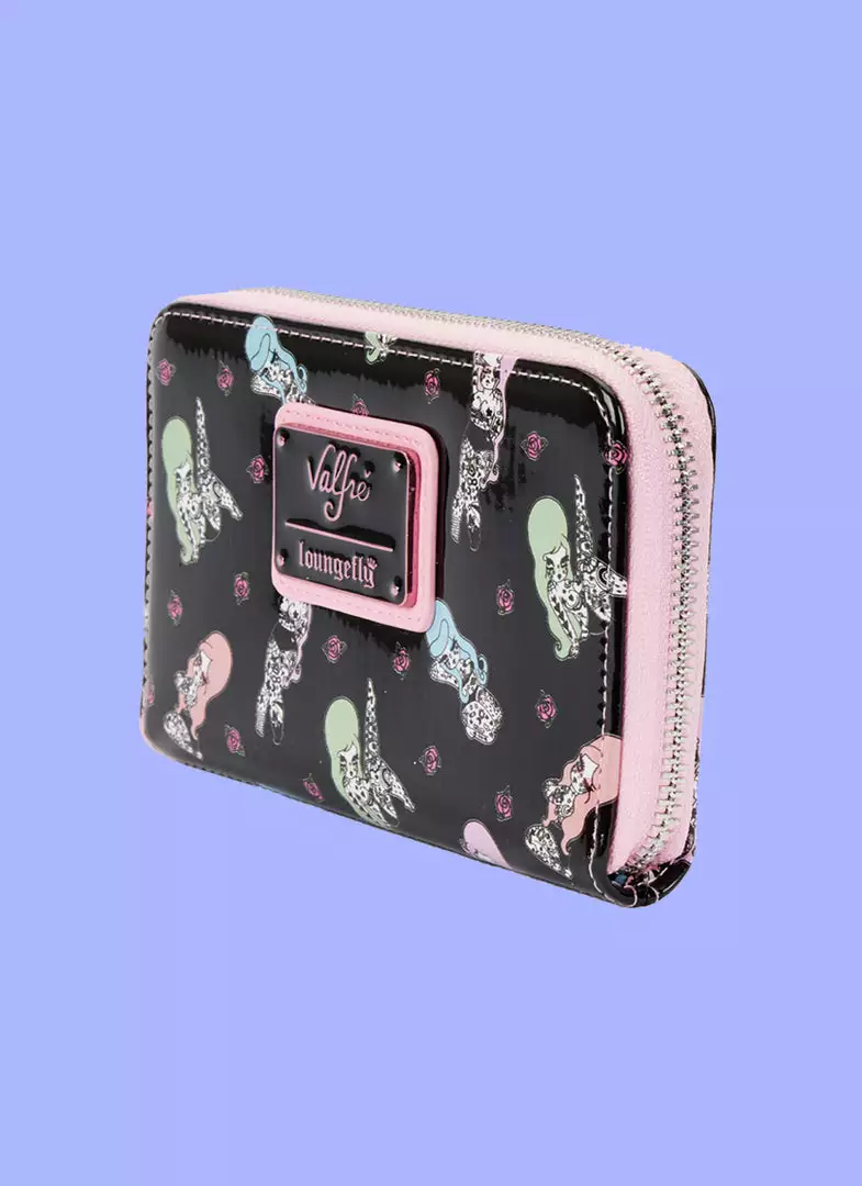 Wallet zips closed. Other features include four slots for cards, a clear slot for holding your ID (which also includes a heart-shaped die-cut detail), pink metal hardwar, vegan leather (polyurethane), and pink topstitch and print details. Note the coordinating lining. Please note: Patterns will vary with all-over-print styles. Not every piece will look identical nor will every piece be an exact match as to what is pictured online.