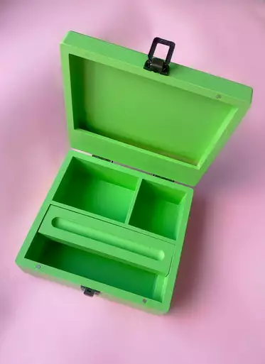 This wooden green stash box features original Valfré artwork, a latch closure, and compartments inside.