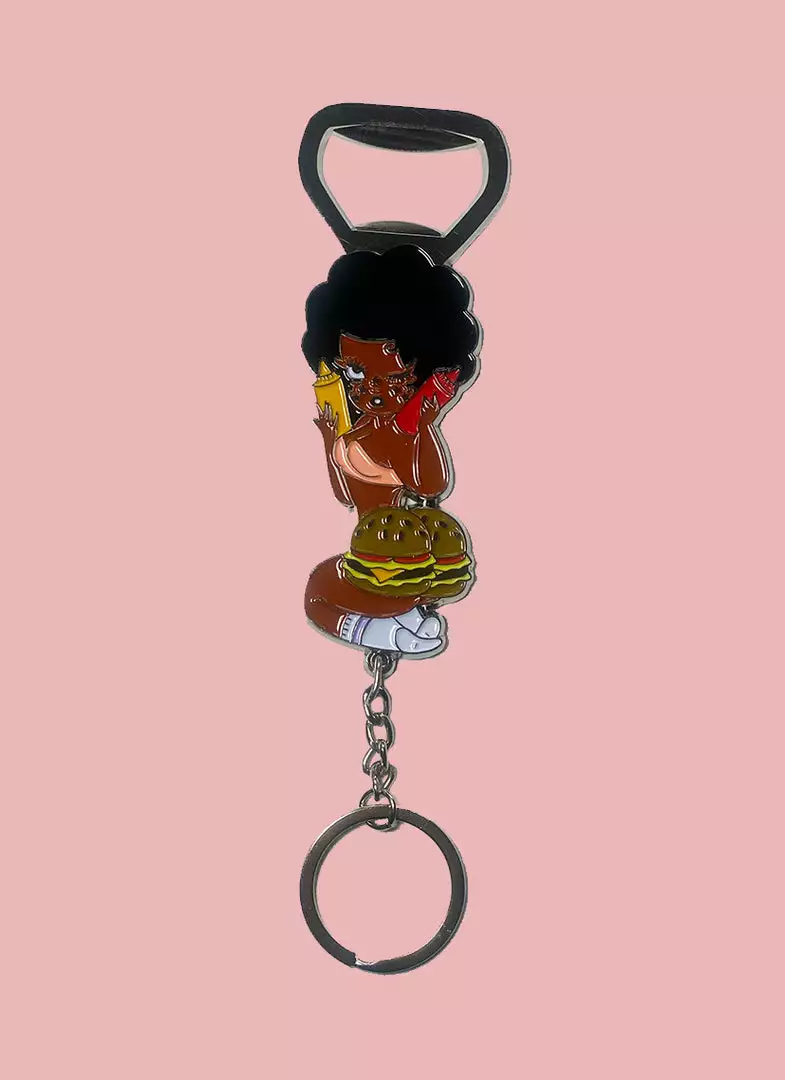 This charm keychain features metal edging and colorful enamel filling complete with a bottle opener, chain link, and key ring.